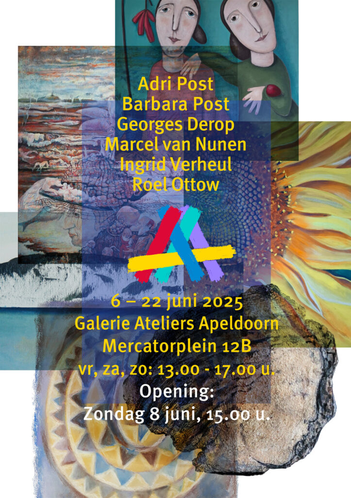Van vrijdag 6 tot en met zondag 22 juni 2025 exposeren zes kunstenaars in Galerie Ateliers Apeldoorn. Adri Post, Barbara Post, Georges Dérop, Marcel van Nunen, Ingrid Verheul en Roel Ottow laten meer dan 100 werken zien. Het zijn niet alleen tekeningen en schilderijen, maar ook ruimtelijk werk met keramiek en hout. De galerie is open op vrijdag, zaterdag en zondag van 14 tot 17 uur.